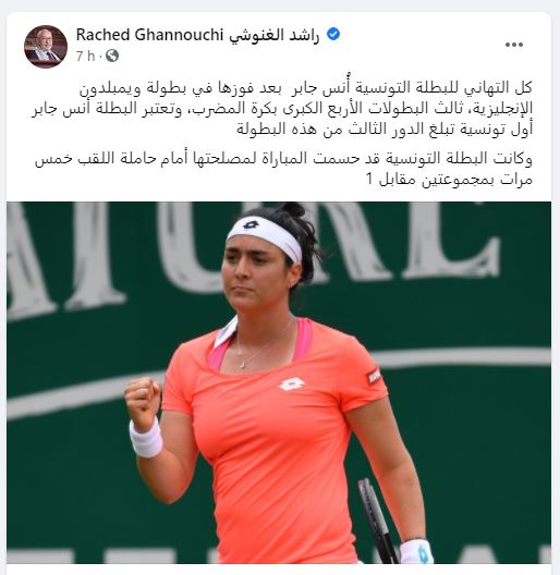 توجه رئيس حركة النهضة ورئيس مجلس النواب راشد الغنوشي بالتهنئة للاعبة التنس أنس جابر بعد فوزها الأخير في الدور السادس عشر من دورة ويمبلدون ثالث البطولات الأربع الكبرى بكرة المضرب.